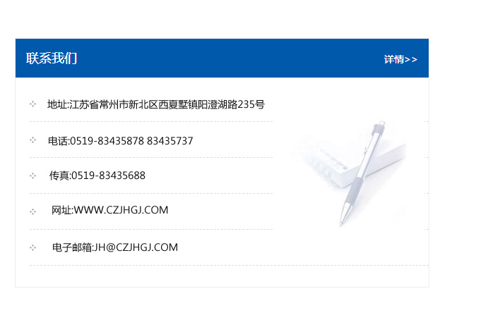 地址:常州市新北區友邦商務大廈1幢16、17層  電話:0519-85101652  傳真:0519-85112595  郵編:213022  網址:www.cz-jiayue_cn.zjltyx.com  郵箱:xiajifengaa@163.com
